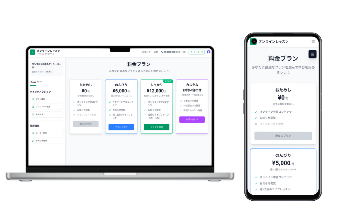 - 必要な機能(例: 定期課金、会員限定コンテンツ、受講管理)を確定し、プラン選定および見積を提示します。