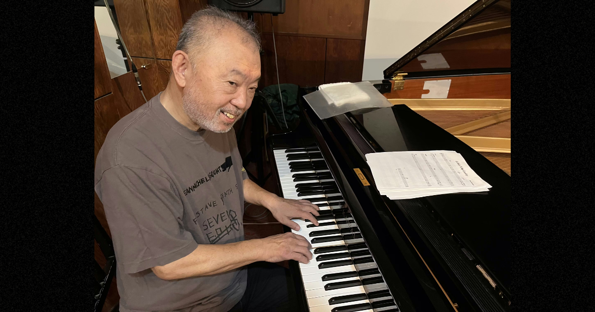 スタジオでピアノに向き合う村上俊二。長年の経験を静かに音へと注ぎ込む姿が印象的です