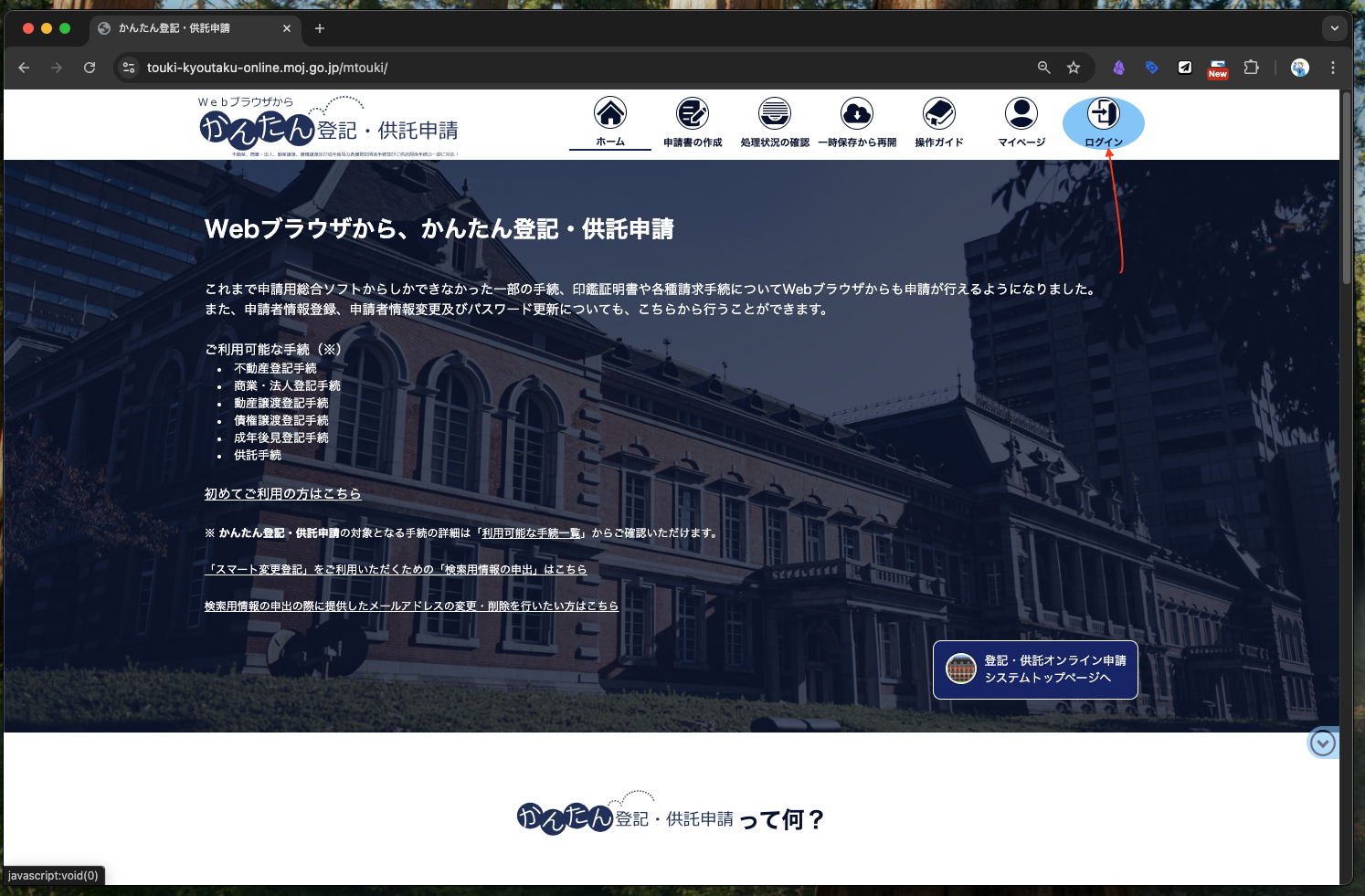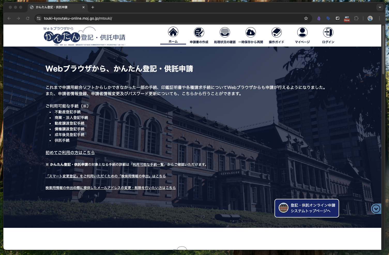 「かんたん登記・供託申請」は、法務省が運営するオンライン申請システムです。法務局の窓口に行かなくても、インターネット上で登記簿謄本(登記事項証明書)の交付請求ができます。