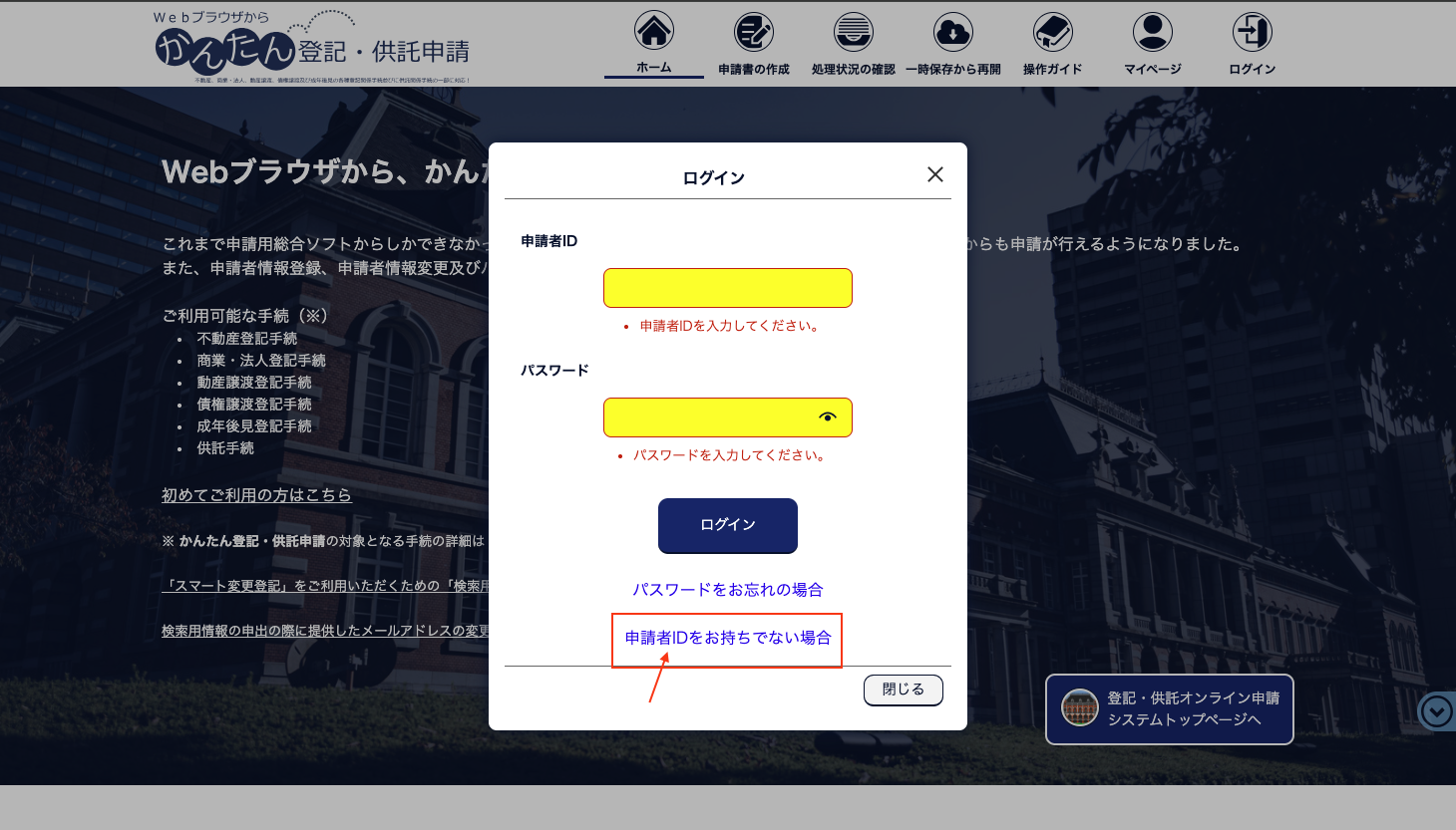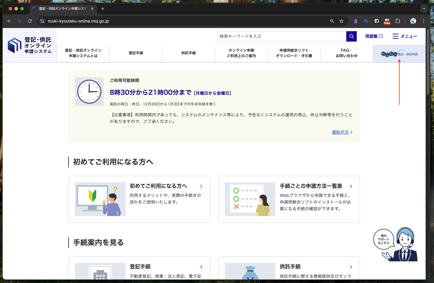 システムトップページに移動したら、ページ右上にある「かんたん登記・供託申請」のタブ(ボタン)を押します。