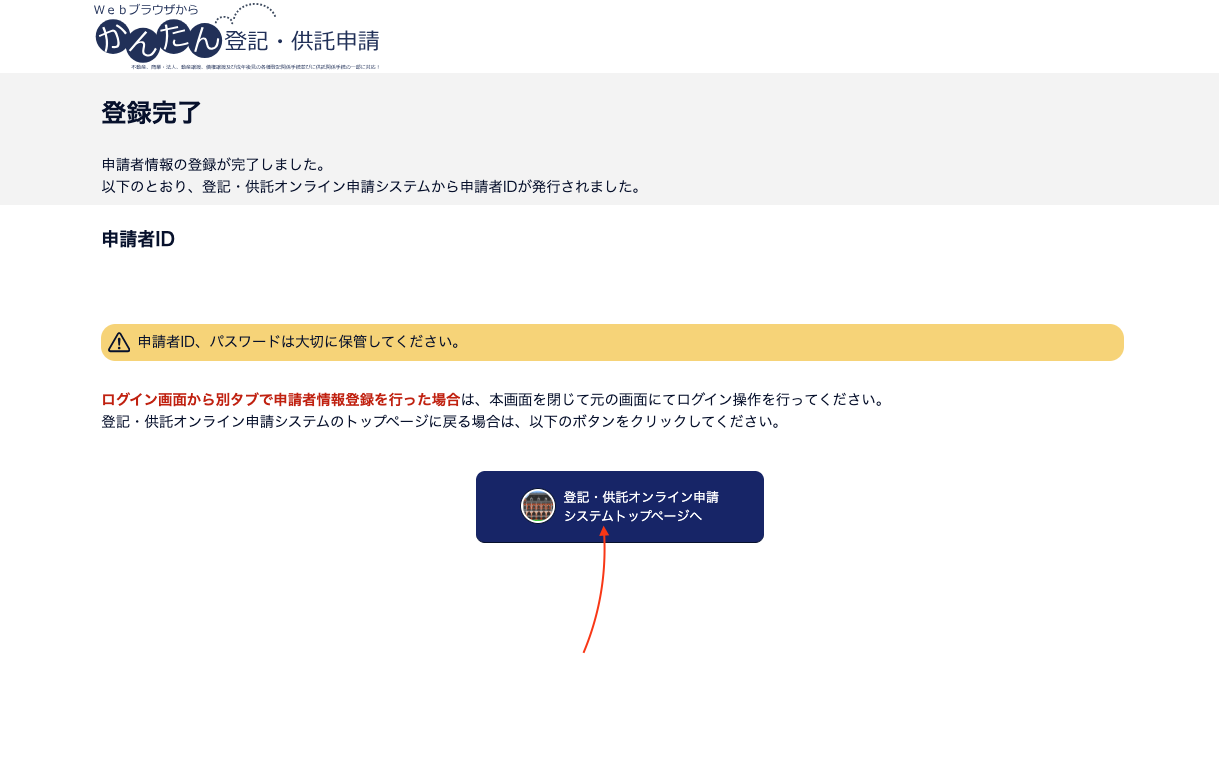 申請者IDが発行されました。画面に表示される「システムトップページへ」を押して、トップページに戻ります。