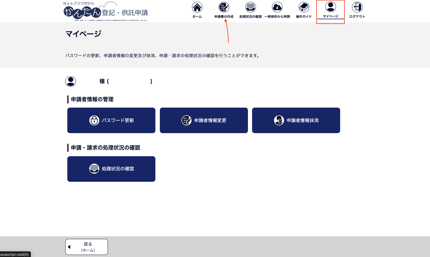 ログインが完了したら、上部メニューの左から2番目にある「申請書の作成」を押します。