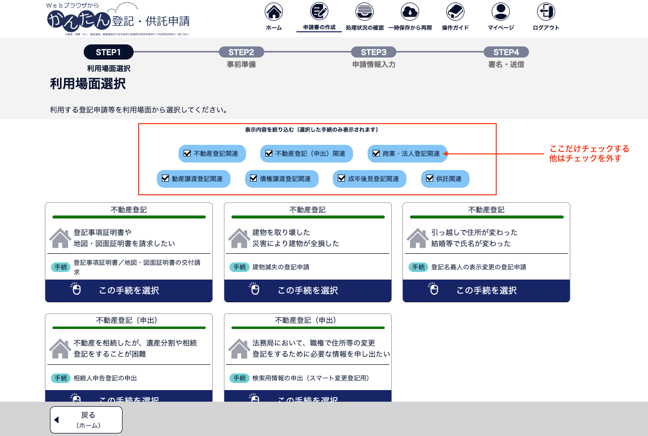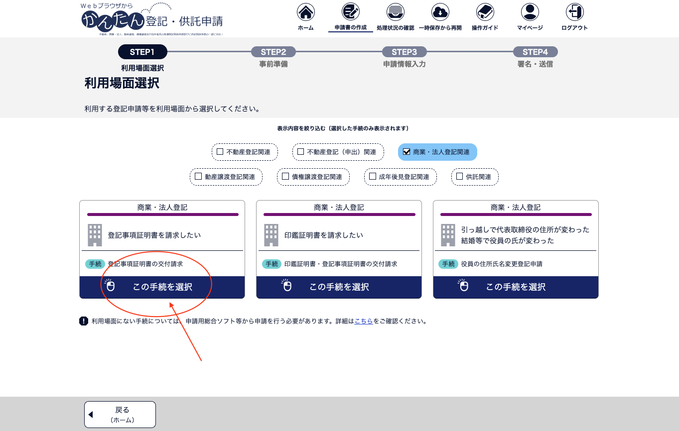 - ログインして「申請書の作成」から「商業・法人登記」を選択する