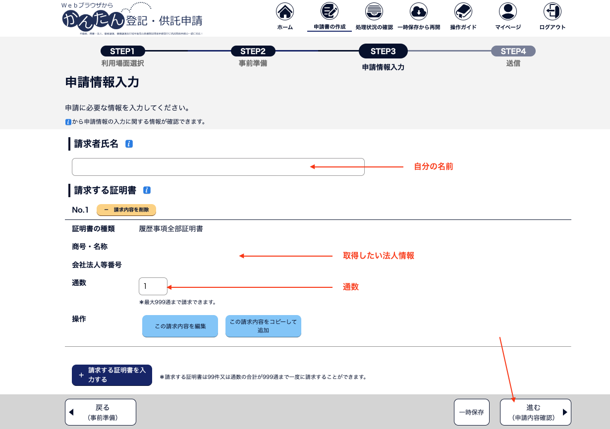 フォームに、取得したい法人の情報や登記簿謄本の通数などを記入します。入力が済んだら「進む」を押してください。