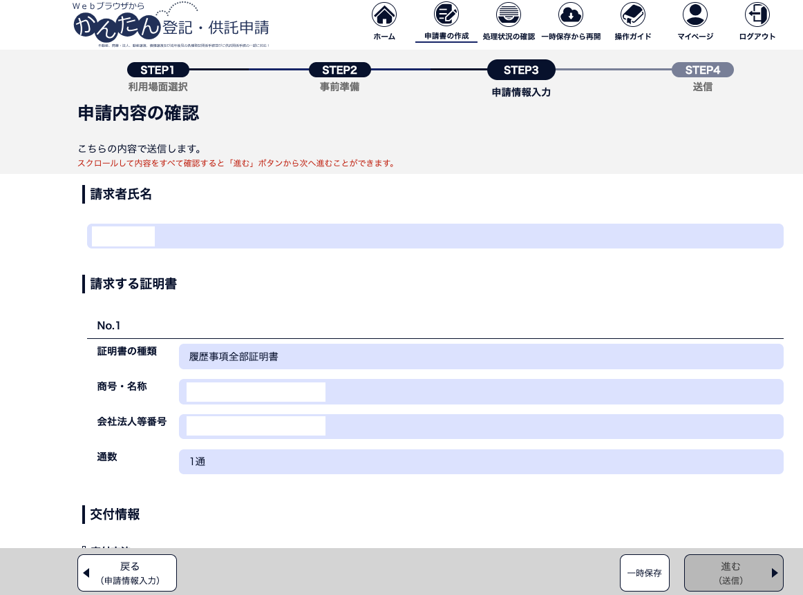 入力内容の確認画面が表示されます。記載に間違いがないか確認し、問題なければ「進む」ボタンを押してください。