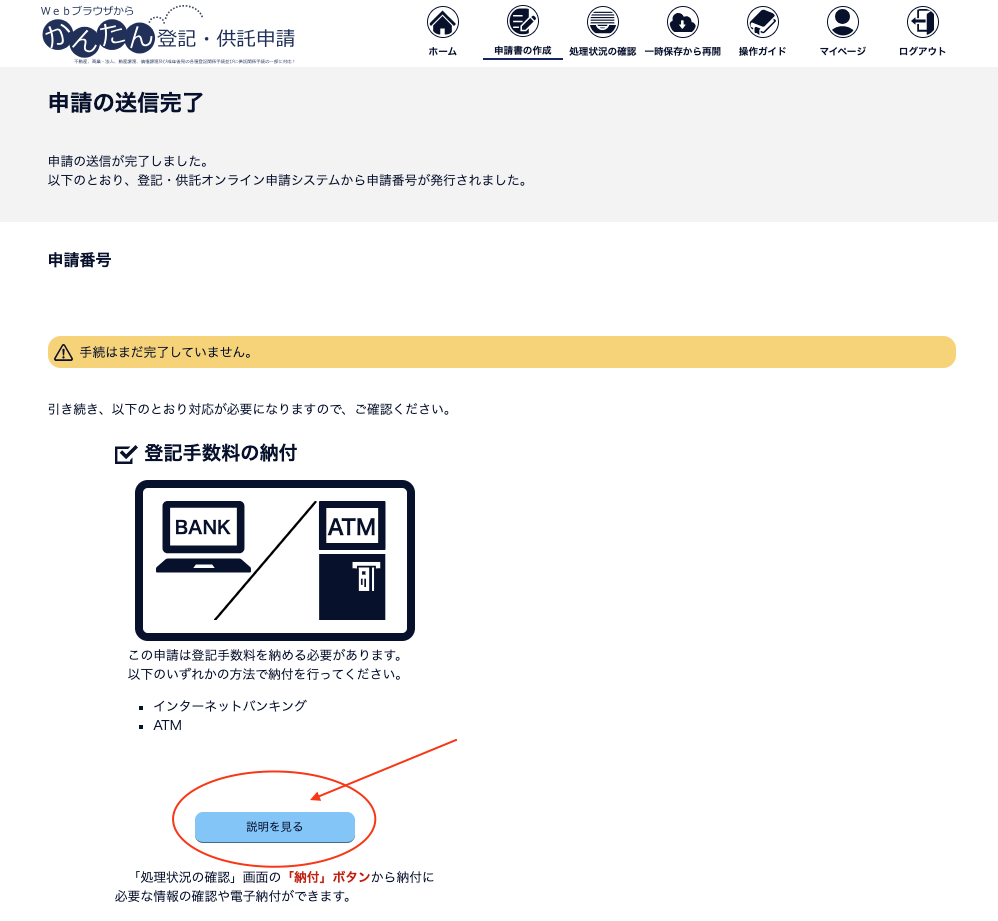 申請が完了すると、画面に以下の4つの番号が表示されます。これらをメモしてください。
